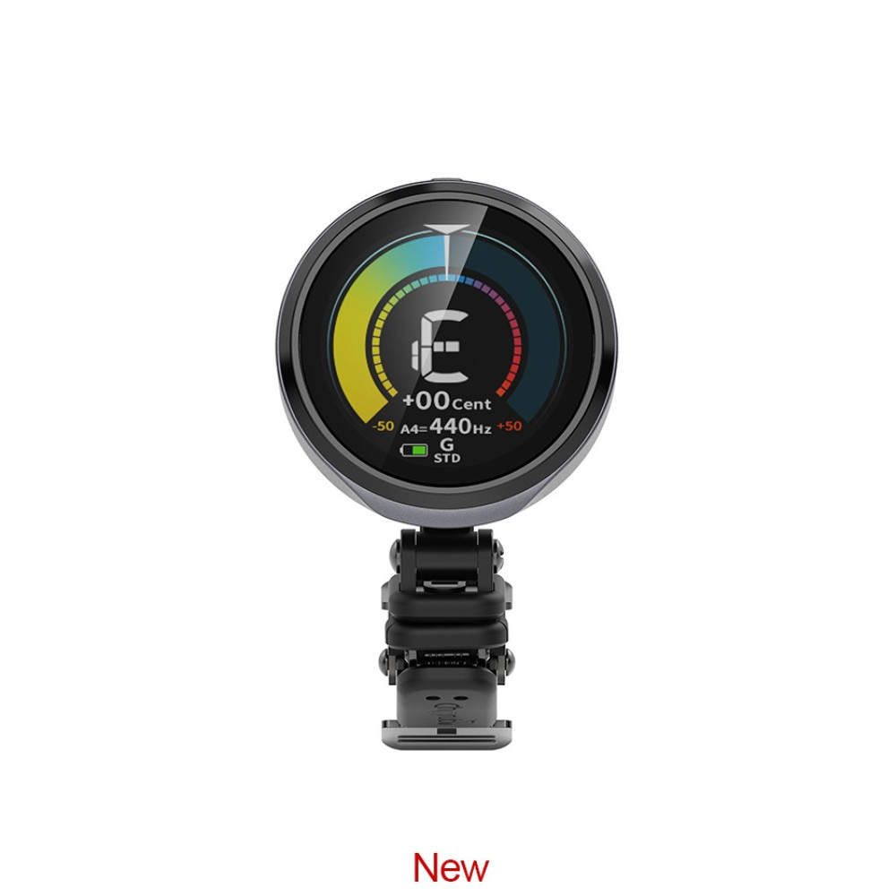 Cuenta con modos de afinación para guitarra, bajo y ukelele, pinza de acero inoxidable, cronómetro integrado y batería recargable de 320 mAh con hasta 4 horas de uso continuo.