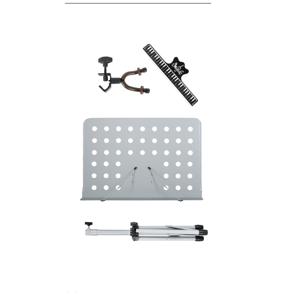 El atril de orquesta TCM MS-533UGY destaca por su acabado en color gris y su bandeja perforada, que ofrece una estructura ligera y resistente, ideal para partituras. Su principal valor añadido es el soporte incorporado para ukelele, una solución práctica para músicos que alternan entre lectura y ejecución durante ensayos o presentaciones.