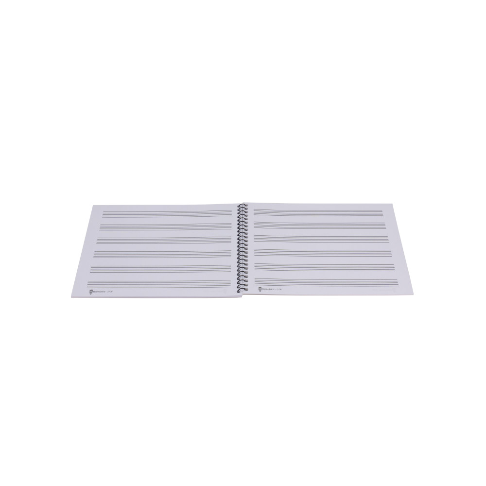 Cuaderno formato 1/4 apaisado con pentagramas para escritura musical. En total, 32 hojas impresas a ambas caras con 6 pautas por hoja.