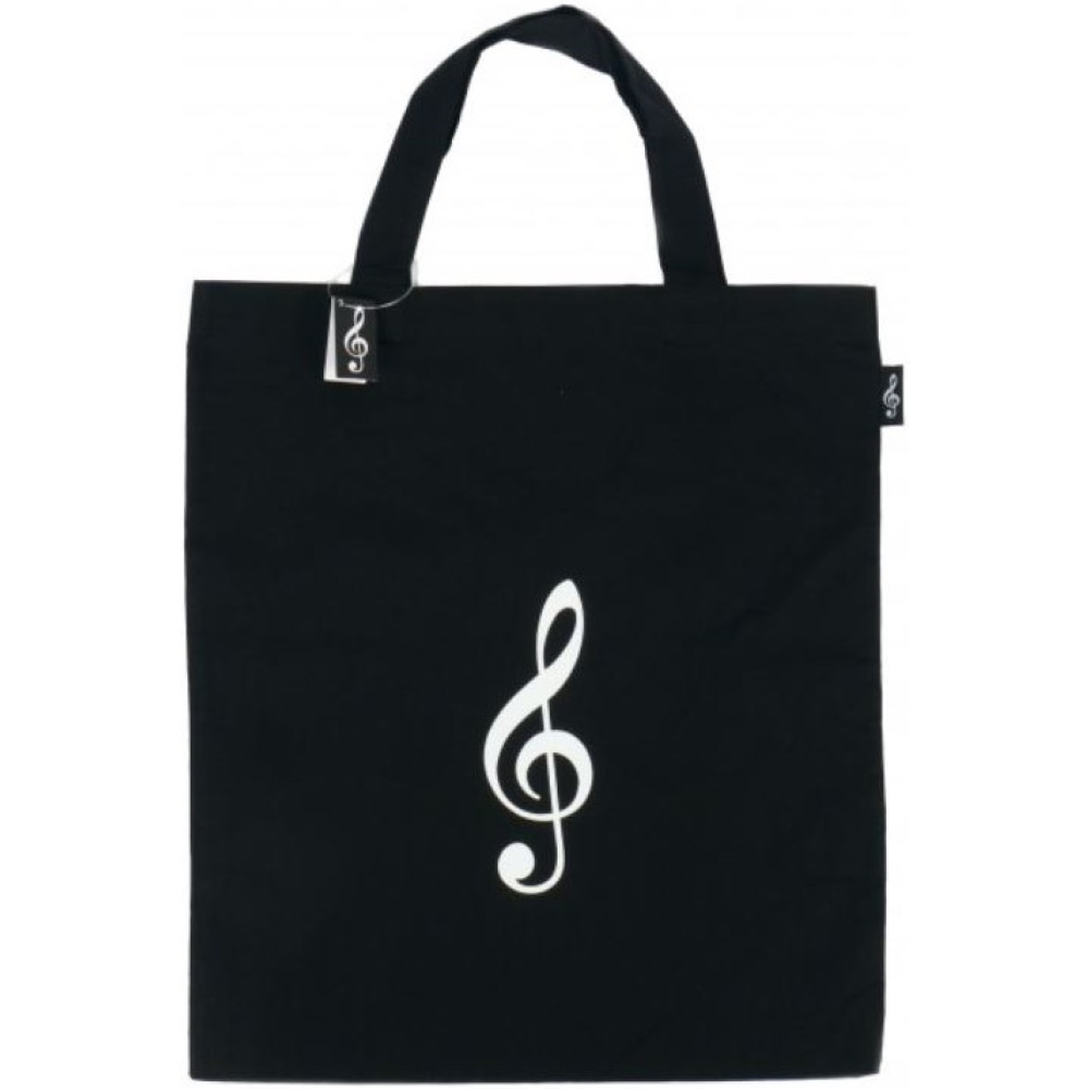 Bolsa con asa G-clef, color negro, adornada con dibujo de clave de sol en blanco.