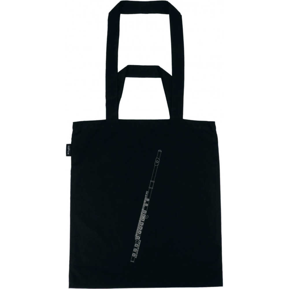 Bolsa con asa color negro adornada con dibujo de flauta travesera. Esta bolsa multiusos es perfecta tanto para llevar tus partituras como incluso tu atril.