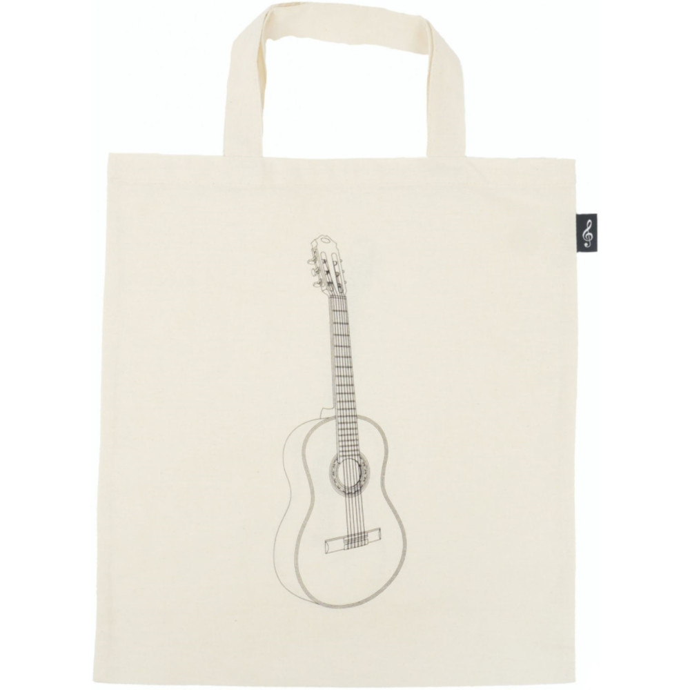 Bolsa con asa color crema adornada con dibujo de guitarra. Esta bolsa multiusos es perfecta tanto para llevar tus partituras como incluso tu atril.