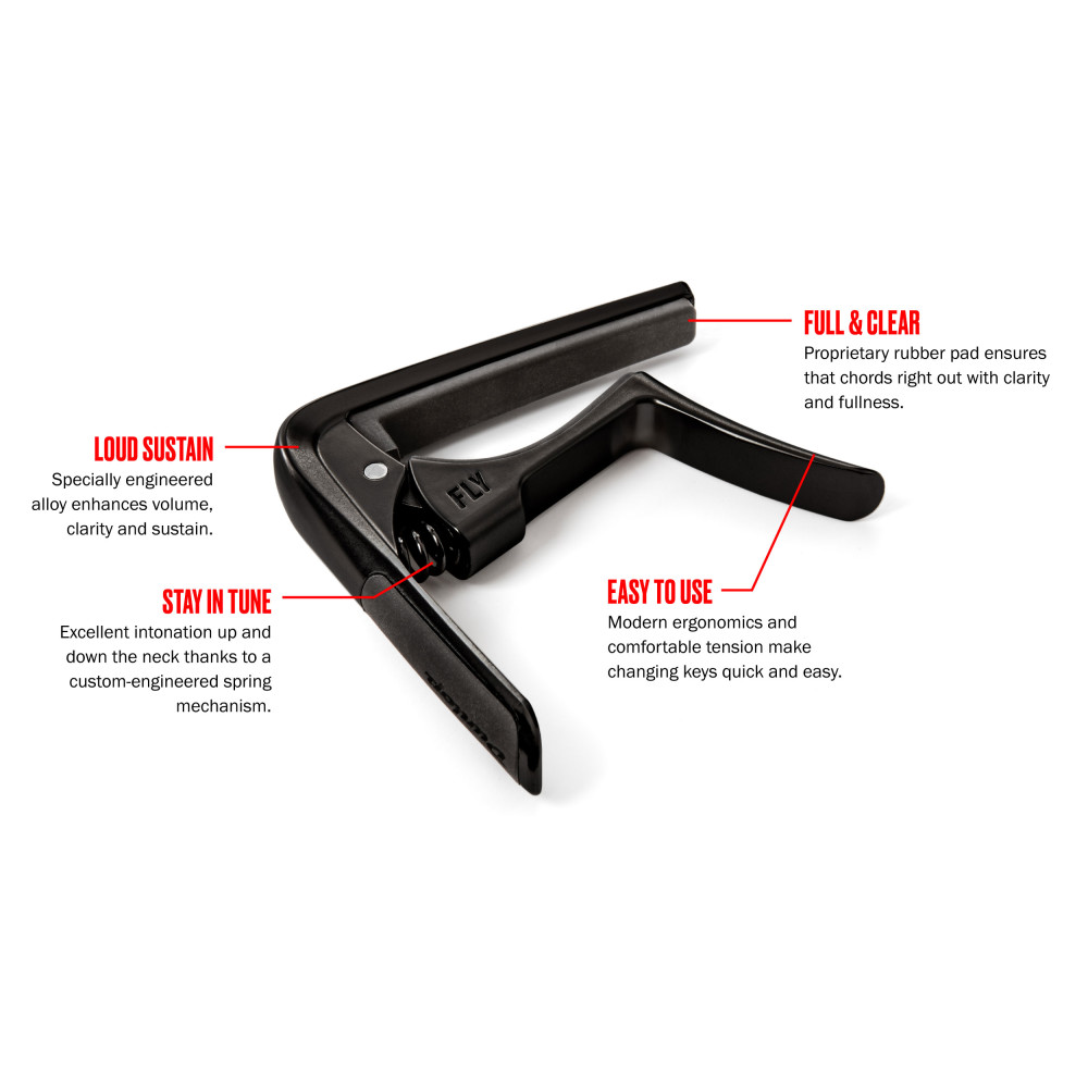 La cejilla jimdunlopusa Trigger Fly Capo, se basa en su diseño de cejilla más popular con mejor manejo y estabilidad de afinación que nunca.