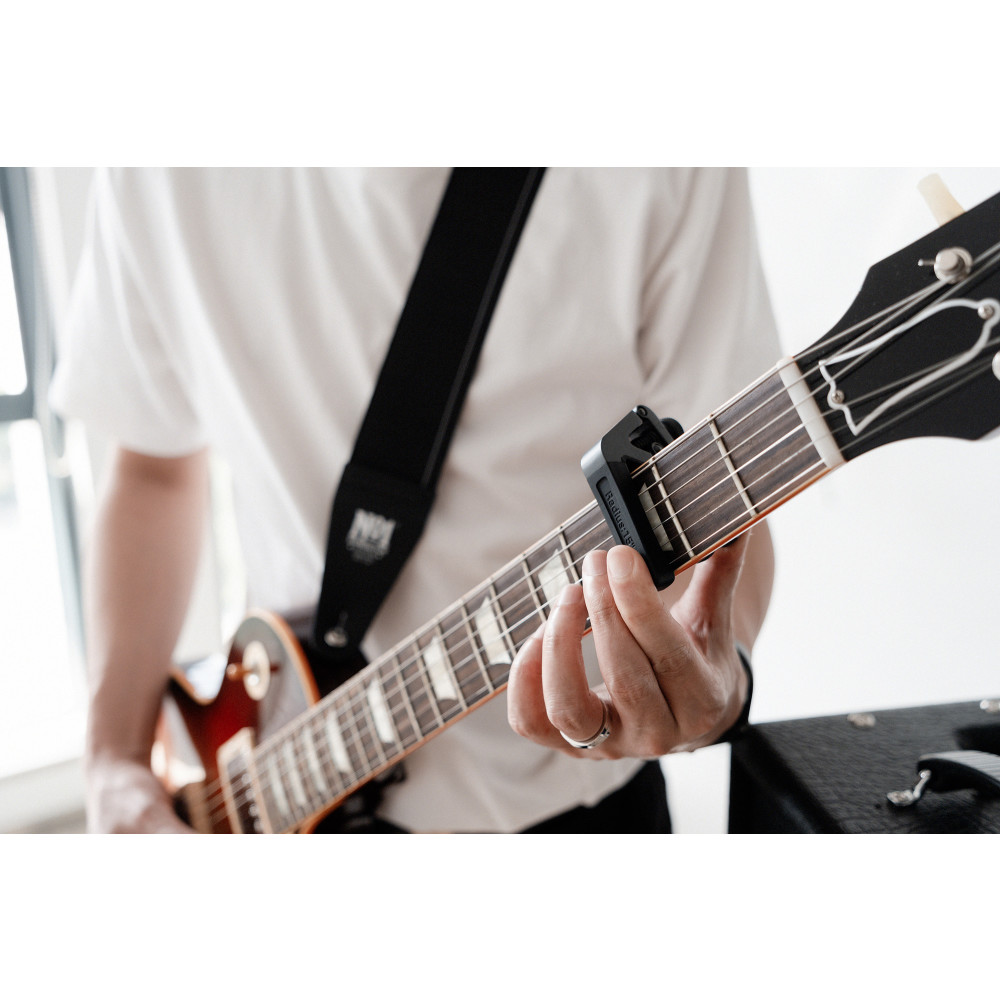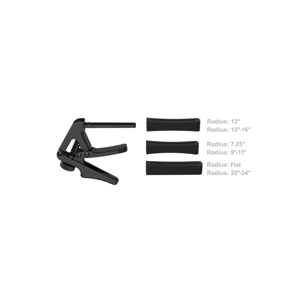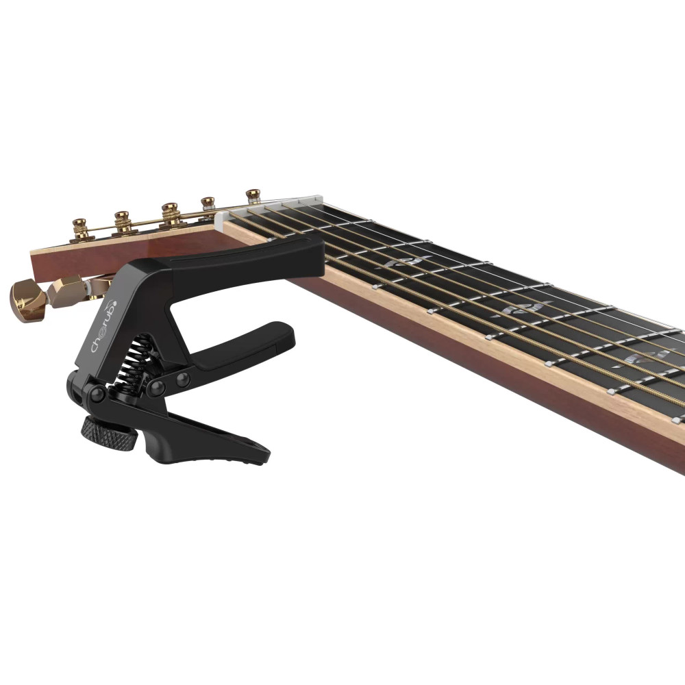 El Cherub CGC-1 es un capo profesional diseñado para adaptarse con precisión a cualquier tipo de guitarra. Su sistema de ajuste incluye tres kits de goma blanda intercambiables que permiten un ajuste perfecto al radio del diapasón, ya sea en guitarras acústicas, eléctricas o clásicas. Gracias a su mando de control de tensión, se evita que la afinación se vea afectada, asegurando siempre una sujeción firme y estable.