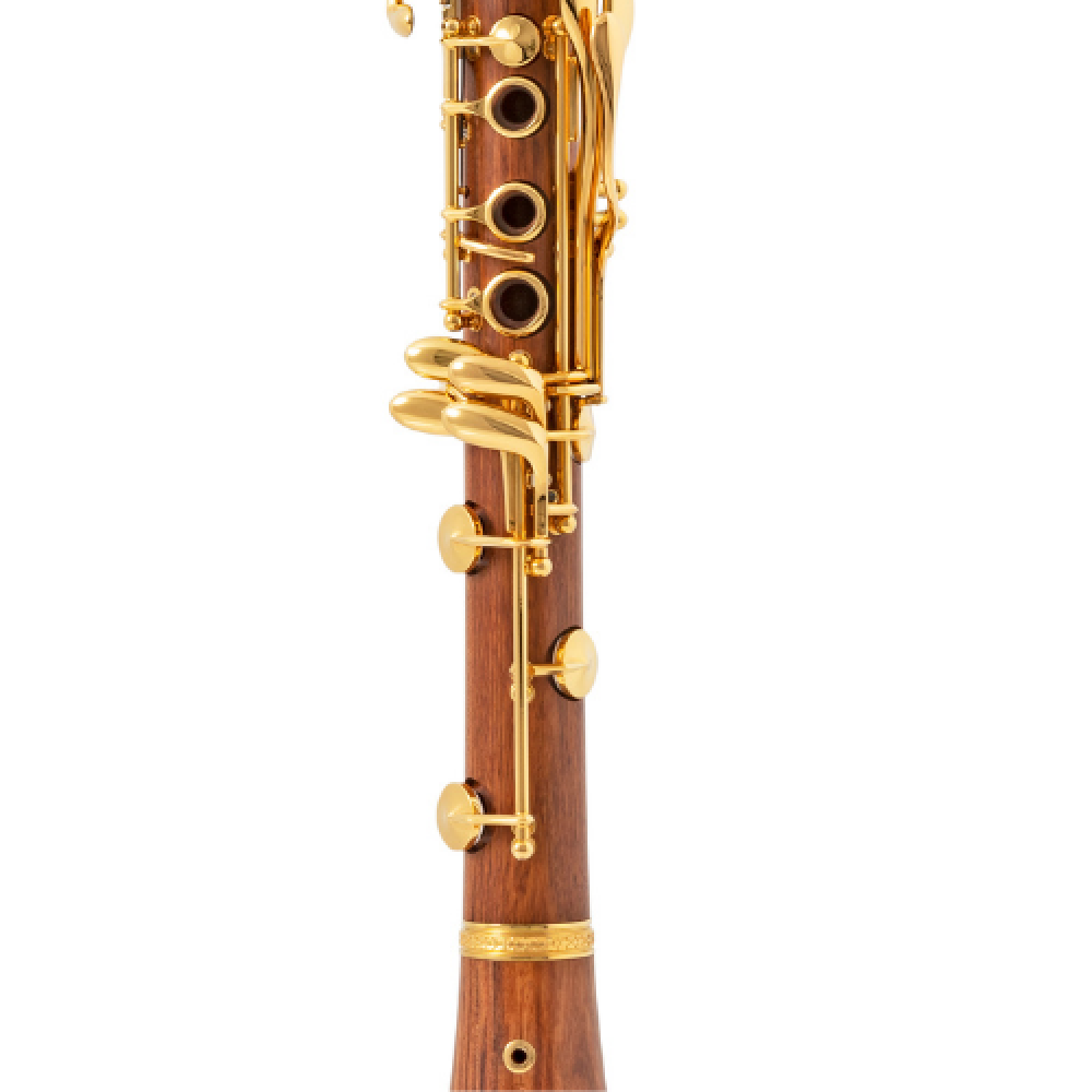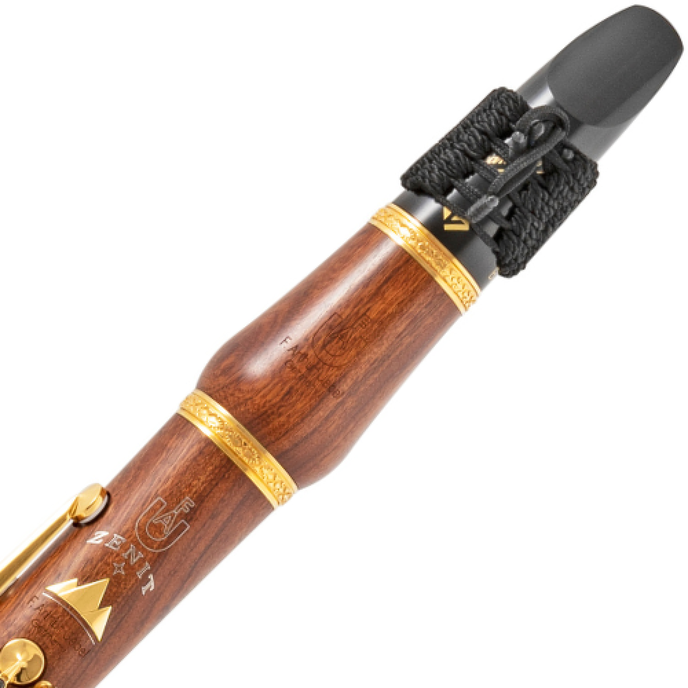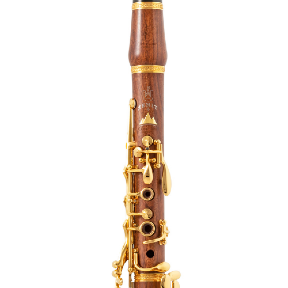 Clarinete Sib fabricado en madera de mopane, con taladro «Zenit» que favorece una proyección precisa. Equipado con 18 llaves y 6 anillos, presenta pilares y llaves chapados en oro de 24 quilates, además de una ornamentación floral en anillo metálico fundido y sello de plata de ley incrustado.