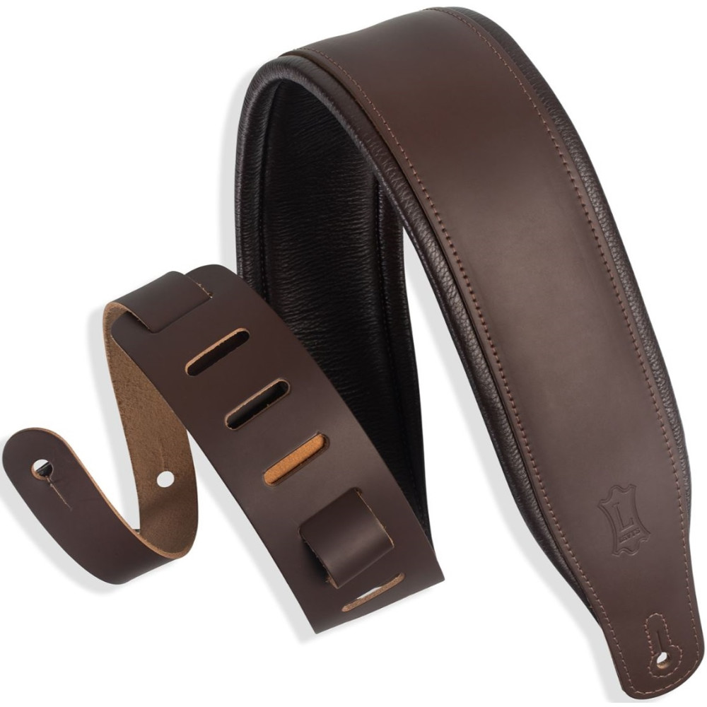 La correa Levy’s M26PD-DBR es una correa de piel marrón especialmente pensada para bajos o guitarras pesadas.