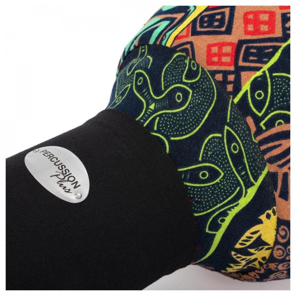 Preafinados y cubiertos con tela de algodón termosellada. Parches sintéticos con la superficie serigrafiada para ayudar a tocar. Base de goma para un perfecto apoyo. se suministra con correa con un clip para fijarla a los aros de metal del djembe.