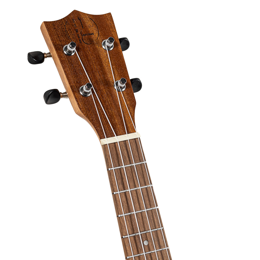 Elaborado con madera de Sapelly, este ukulele concert cuenta con un mástil de Okume, cejuelas de hueso, puente y diapasón de nogal, y clavijeros abiertos en color negro. Su precioso acabado satinado natural atrae a cualquiera que lo mire por su preciosa roseta grabada a láser.