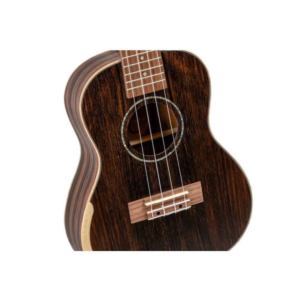 Elaborado con madera de Ebano, este ukulele concert cuenta con un mástil de Okume, cejuelas de hueso, puente y diapasón de nogal, y clavijeros Die-cast en cromado.