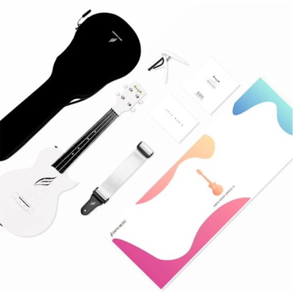 Ukelele elaborado principalmente de fibra de carbono y policarbonato. Tiene un acabado satinado y tan solo pesa 566 gramos.