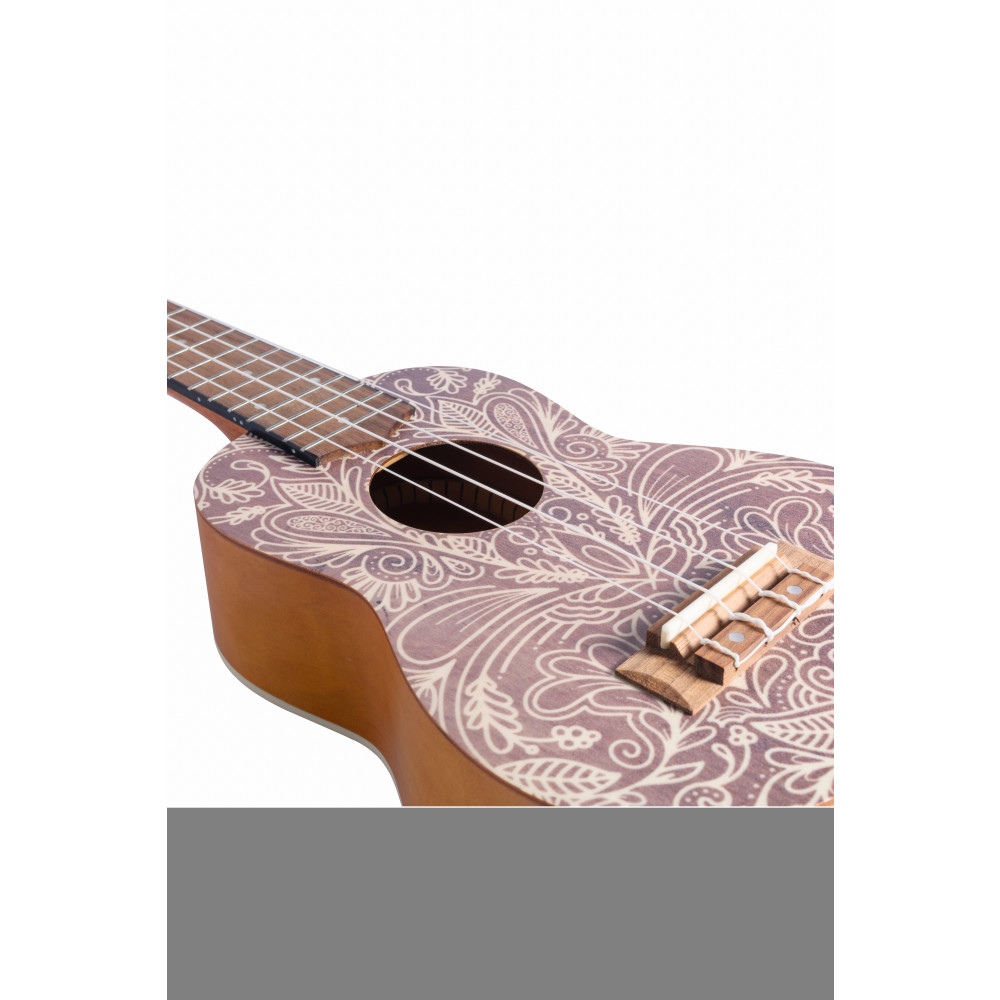 Ukelele soprano elaborado con madera de sapelly y decorado con un precioso dibujo con motivos naturales en color blanco.