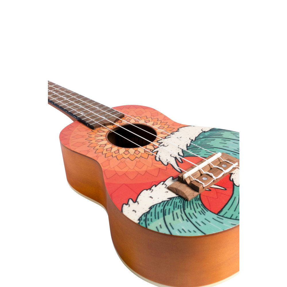 Ukelele Soprano 21″ marca Bamboo modelo Orange Wave, acabado en mate, color madera con estampado de una ola