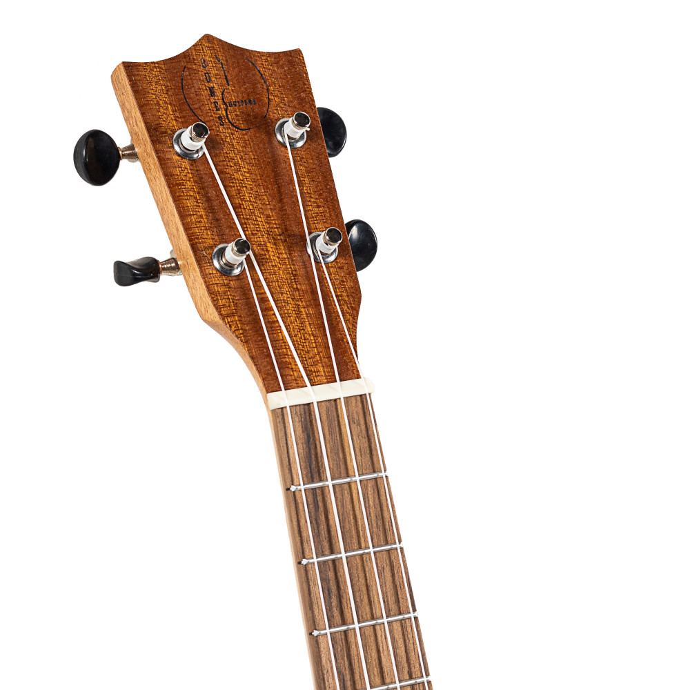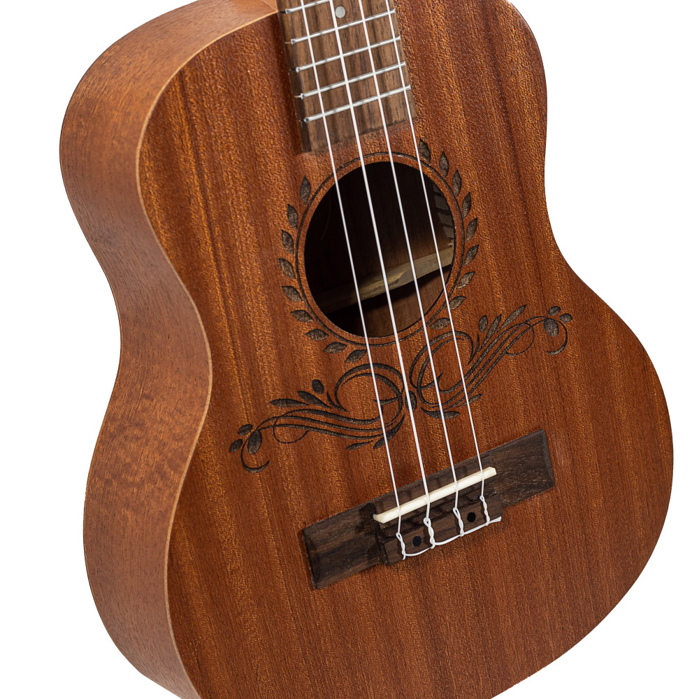 Elaborado con madera de Sapelly, este ukelele tenor cuenta con un mástil de Okume, cejuelas de hueso, puente y diapasón de nogal, y clavijeros abiertos en color negro. Su precioso acabado satinado natural atrae a cualquiera que lo mire por su preciosa roseta grabada a láser.
