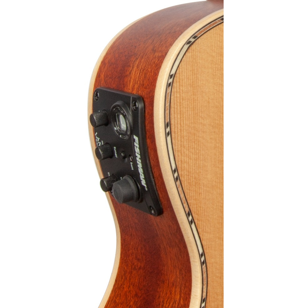 El Lanikai CDST-CET es un ukulele de tamaño soprano con tapa sólida de cedro y cuerpo de caoba laminado. Sus cejuelas de Nubone XB® le aportan al ukulele sustain y tono. Amplificado gracias a su sistema Fishman Kula preamp con afinador incorporado